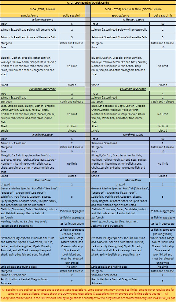 With a Tribal harvest license, you can now fish for all species that do not require a special ODFW fishing tag within the MOA boundary and associated marine zone. You are still restricted to all ODFW rules, including daily bag limits, gear restrictions, zone restrictions and seasons. No commercial fishing allowed.